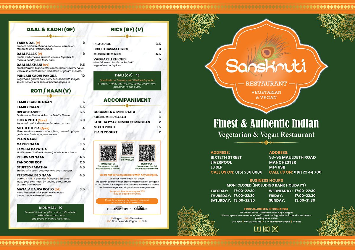 Sanskruti Restaurant, located on Bixteth Street in Liverpool, offers a vibrant and authentic Indian dining experience. Known for its rich, flavorful dishes and stylish atmosphere, it stands out as a gem for those seeking high-quality Indian cuisine. The menu at Sanskruti features a broad selection of vegetarian and vegan options, making it an ideal choice for both plant-based eaters and traditional curry lovers.