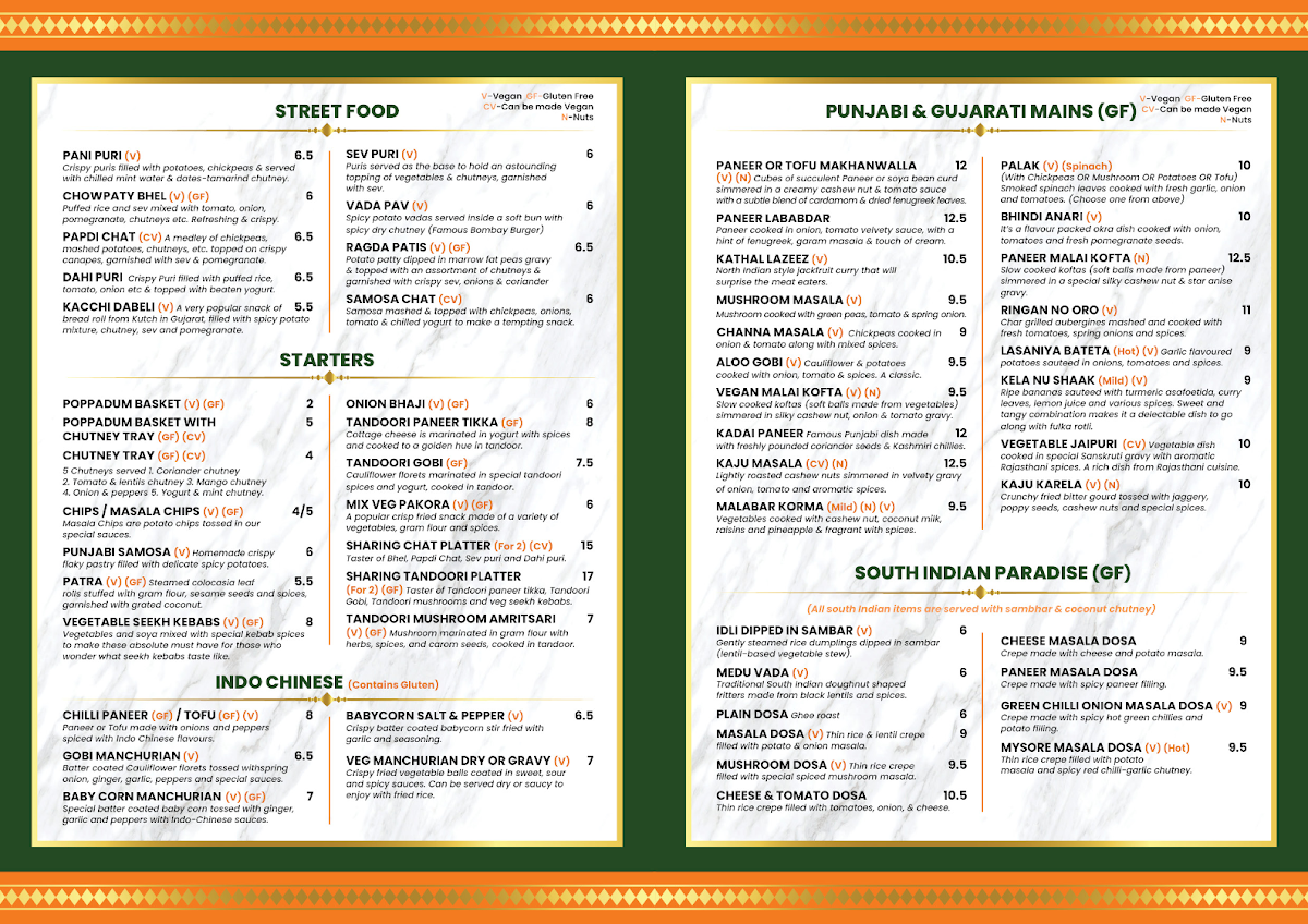 Crispy puris filled with potatoes, chickpeas & served with chilled mint water & dates-tamarind chutney.